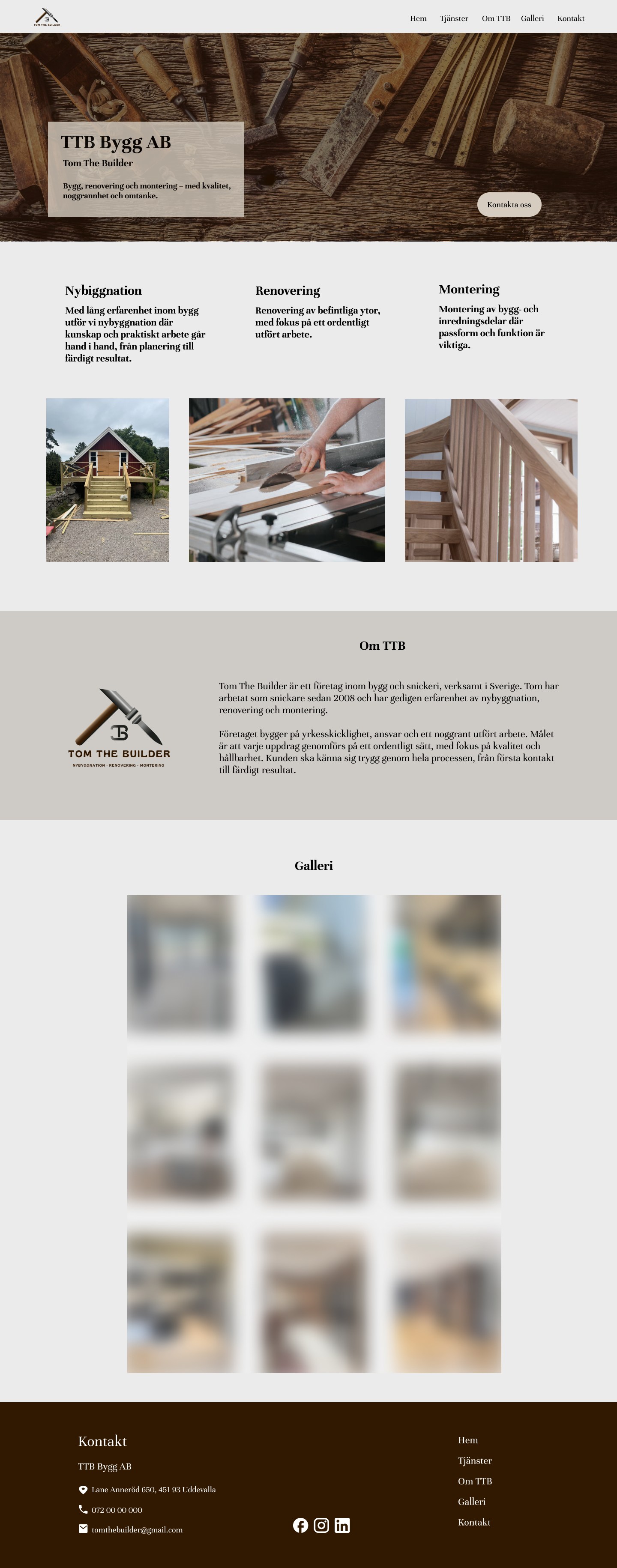 Tom The Builder (TTB) är ett företag inom bygg och snickeri med lång yrkeserfarenhet. Företaget arbetar med nybyggnation, renovering och montering och har sin grund i hantverk, pålitlighet och ett jordnära arbetssätt.